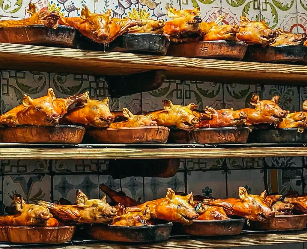 Meals in Madrid were unforgettable. Casa Botín (c. 1725), recognized by Guinness World Records as the world’s oldest restaurant, showcased racks of suckling pigs, and our own was carved right at the table, with its crisp skin crackling under the knife. The next day, we wandered through Madrid’s iconic San Miguel Market, one of Europe’s largest culinary halls, brimming with stalls offering artisanal treasures from every corner of Spain — cheeses from La Mancha, olives from Andalusia, and rich Iberian ham from Extremadura. Other popular options included empanadas with different fillings, tostadas with anchovies and bacalhau (cod), as well as more traditional Spanish dishes like omelets, tapas, fried cod fritters (buñuelos de bacalao), patatas bravas (Spanish fried potatoes), as well as raw produce and cured meats. We ended the night with paella, the national dish of Spain, at La Barraca, a beloved city landmark. A server there explained that their paella features Bomba rice, a dense, pearl-like grain that holds its shape in the fumet (broth).